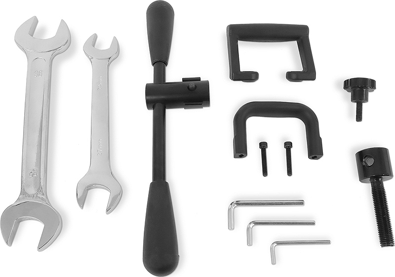 - Комплектуется 4-мя крепежными болтами, боковой рукояткой для переноски стойки, 2-мя удлиненными болтами с головкой под внутренний шестигранник для монтажа верхней рукоятки, 2-мя рожковыми ключами (24 × 27 и 32 × 36), 3-мя угловыми шестигранными ключами, распорным болтом-головкой, 2-мя съемными ножками-упорами, 4-мя юстировочными болтами, фиксатором каретки, рукояткой-штурвалом