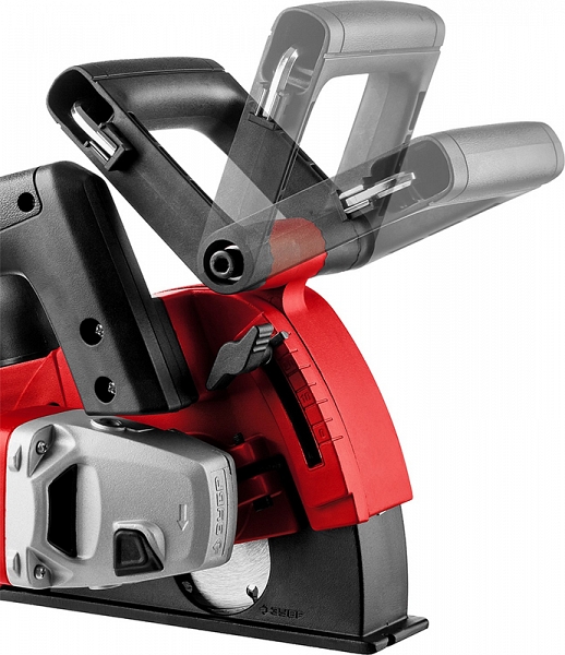 - Закрывающий зону работы подпружиненный кожух предотвращает разброс продуктов реза при любой глубине штробы